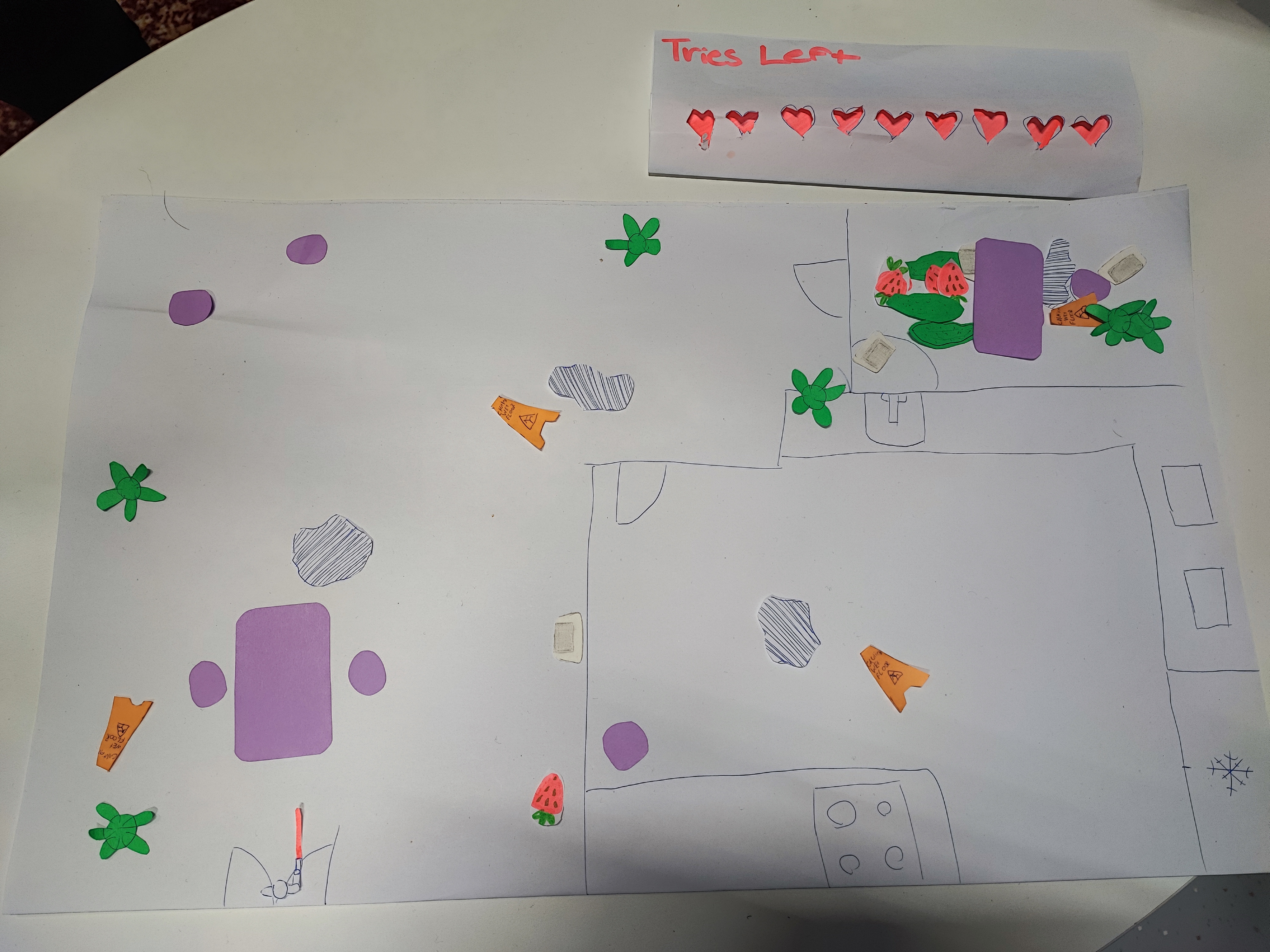 We had a wide white paper that has the general map drawn on it, we had many different small paper pieces serving as props such as some chairs, tables, plants, puddles and so on. Along with that we finalised our rules in the game in a way is balanced. We decided that the total number of players that could play the game is going to be 6-8 (hunter included). We also decided on the hunter having 9 lives/trials before them losing the game. Each time he picks a wrong prop, a life is being taken out. To make the hunter a bit of more funny role we made a small model with a pistol where he can go roam around the room and point at the object he wants to shoot. In the end we put it on a table for professors and students to try it out, and was pleasant to see people playing the game.